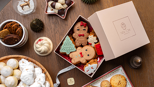 Mini chip cookies in a box, hand-decorated one by one, with lots of care and attention to detail.