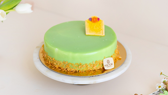 A triple creamy cake with pistachio crème brûlée, chocolate cream and pistachio mousse, surrounded by chocolate moist sponge specially decorated for Easter celebrations!
